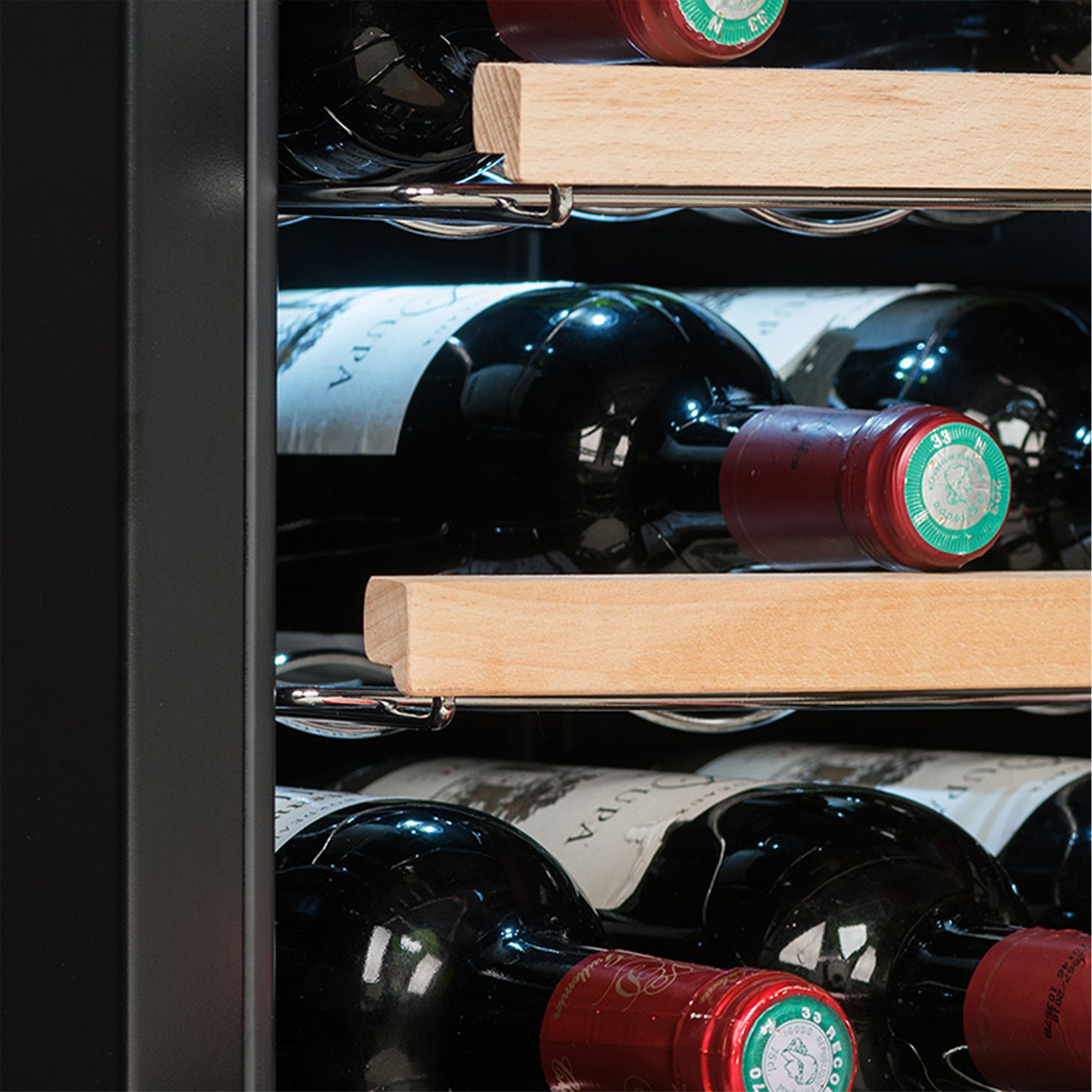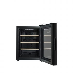 Vinskapet er utstyrt med UV-beskyttet glassdør og integrert touch-panel i front. Det har tre ståltrådhyller med fronter i tre og kjølig hvitt LED-lys. Det stilrene designet i svart og antrasittgrått passer perfekt inn i moderne interiør.