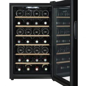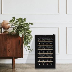 Frittstående vinskap/serveringskap fra franske La Sommeliere med kapasitet for opptil 28 flasker (standard Bordeaux-flasker).