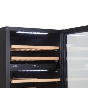 Moderne vinskap med skandinavisk design, med svart glassfront og integrert håndtak. Utstyrt med naturlig trehyller og hvit innvendig LED-belysning. Digitalt berøringspanel for full kontroll over justerbar temperatur og innvendig belysning. Skagen-serien er skapt for en sømløs passform når den er integrert i kjøkkenet og interiøret. Du kan også plassere vinskapet ditt frittstående hvis du foretrekker en mindre permanent plassering.